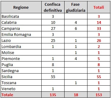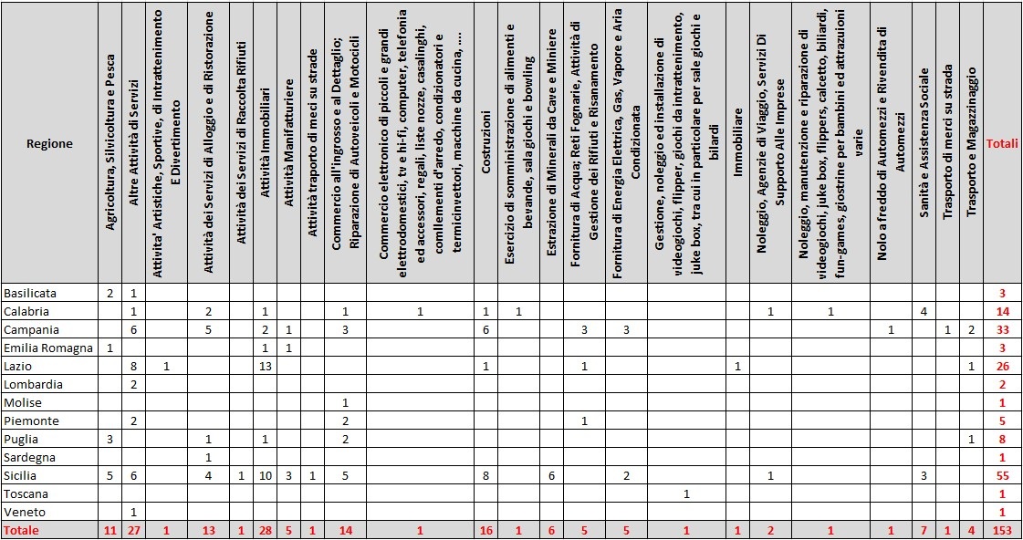 Alla data della presente pubblicazione, le aziende amministrate dall’ANBSC attive sul mercato sono complessivamente 153, suddivise tra aziende in confisca definitiva e non definitiva. Di seguito si riportano l’elenco delle aziende attive e i prospetti di sintesi relativi alla loro distribuzione territoriale e ai settori merceologici di riferimento